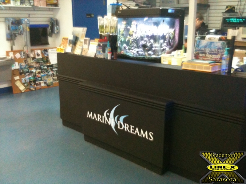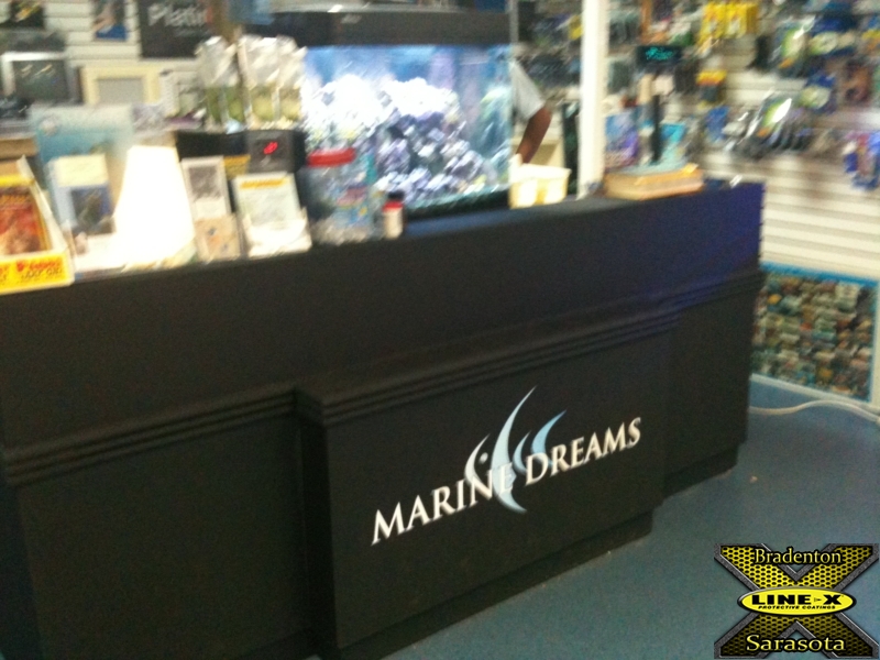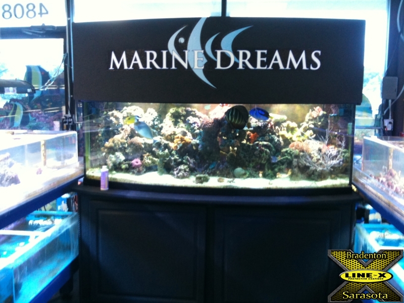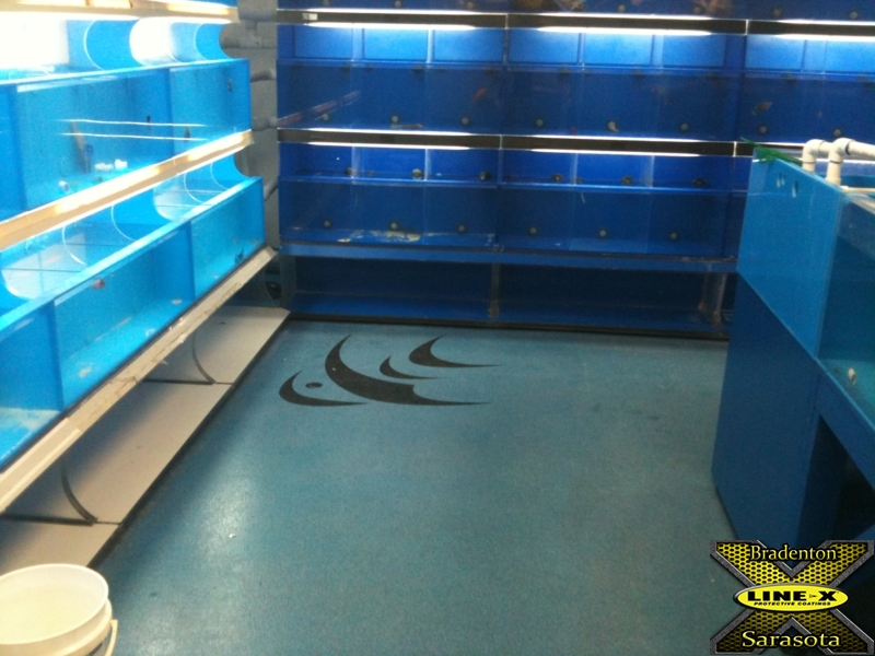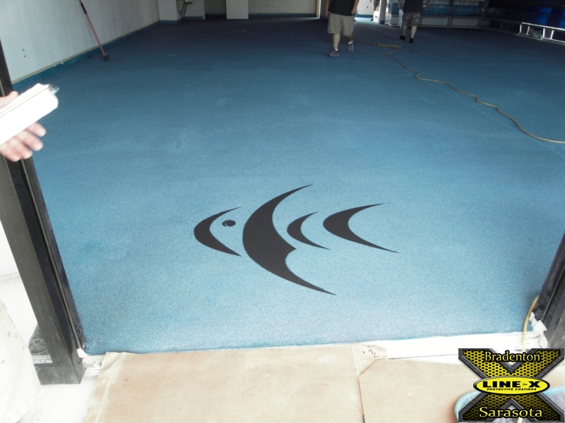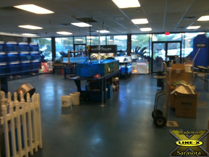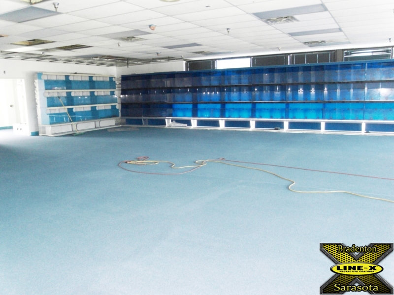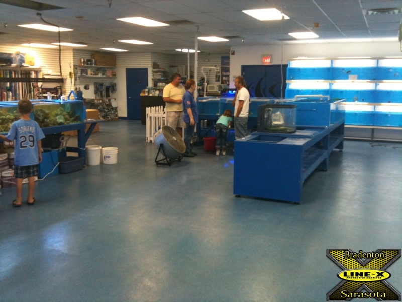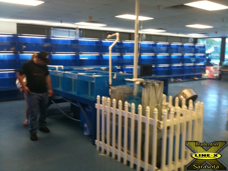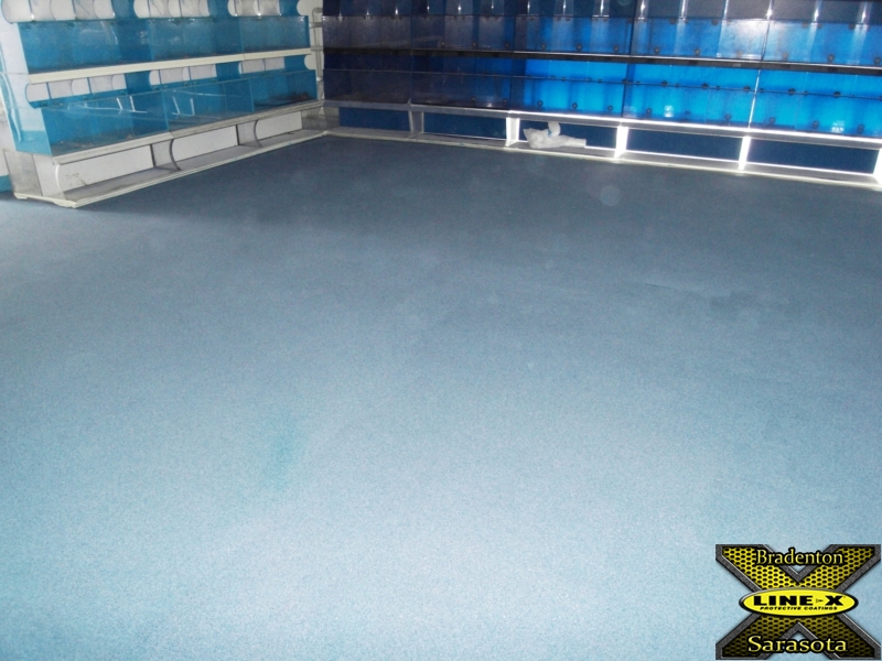 Marine Dreams of Bradenton Florida has been a valuable customer to Line-X for the past few years. We have sprayed aquarium stands with Line-X to protect and seal the wood against the harsh and unforgiving salt water. Marine Dreams recently relocated their shop, and hired Line-X to complete a high performance floor to compliment the beautiful aquarium showroom. Line-X was hired to develop and complete a seamless multi-build quartz flooring system using the new Aspart-X flooring technology by Line-X