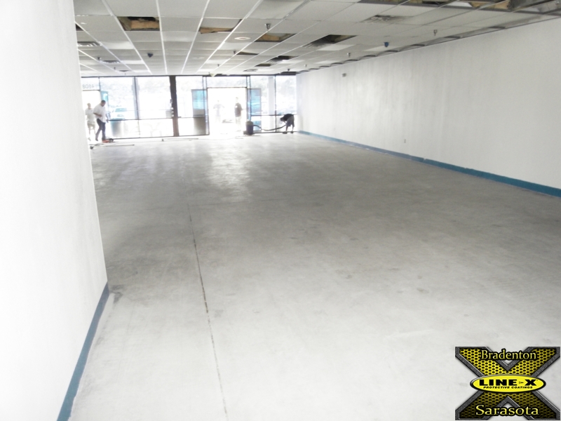 Having first decided to go with a “cheaper” epoxy floor system Marine Dreams unfortunately found out the hard way cheaper is not always better. The list of what went wrong with the initial floor our competitors used is long including wrong color, swirl marks in the floor, mismatching compared the chosen floor sample and so on. The contractor not only lost thousands of dollars but he was also left responsible to remove the floor himself since the hired company would not return calls and went missing in action! (We were somewhat surprised how easily the epoxy floor system was removed; large sheets came up very easily!) Under a tight timeline for completion Line-X was called to apply the Aspart-X Quartz Floor System in a hurry at Marine Dreams.